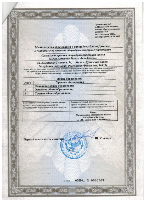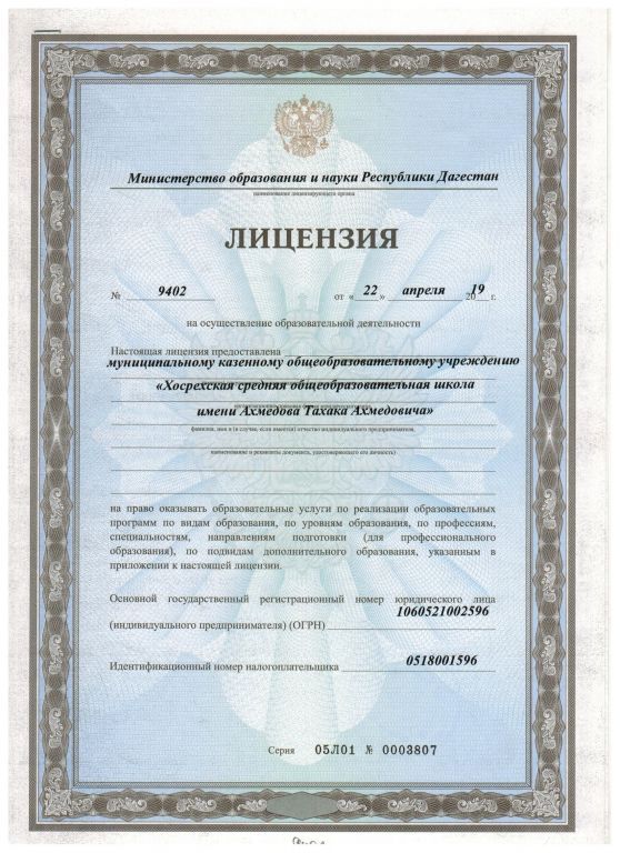 | Полное наименование образовательной организации* | Муниципальное казенное образовательное учреждение "Хосрехская средняя общеобразовательная школа им.Ахмедова Т.А." |